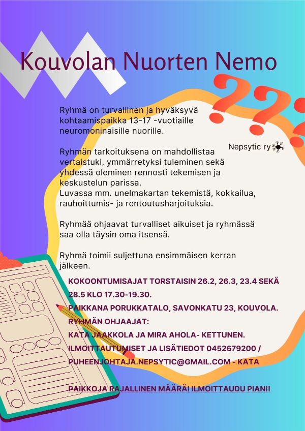 Vertaisryhmä Nepsy-oireisille ja neuromoninaisille aikuisille, Teams-alustalla. Ensimmäinen kerta on avoin, jonka jälkeen ryhmä sulkeutuu. Maksuton osallistujille.